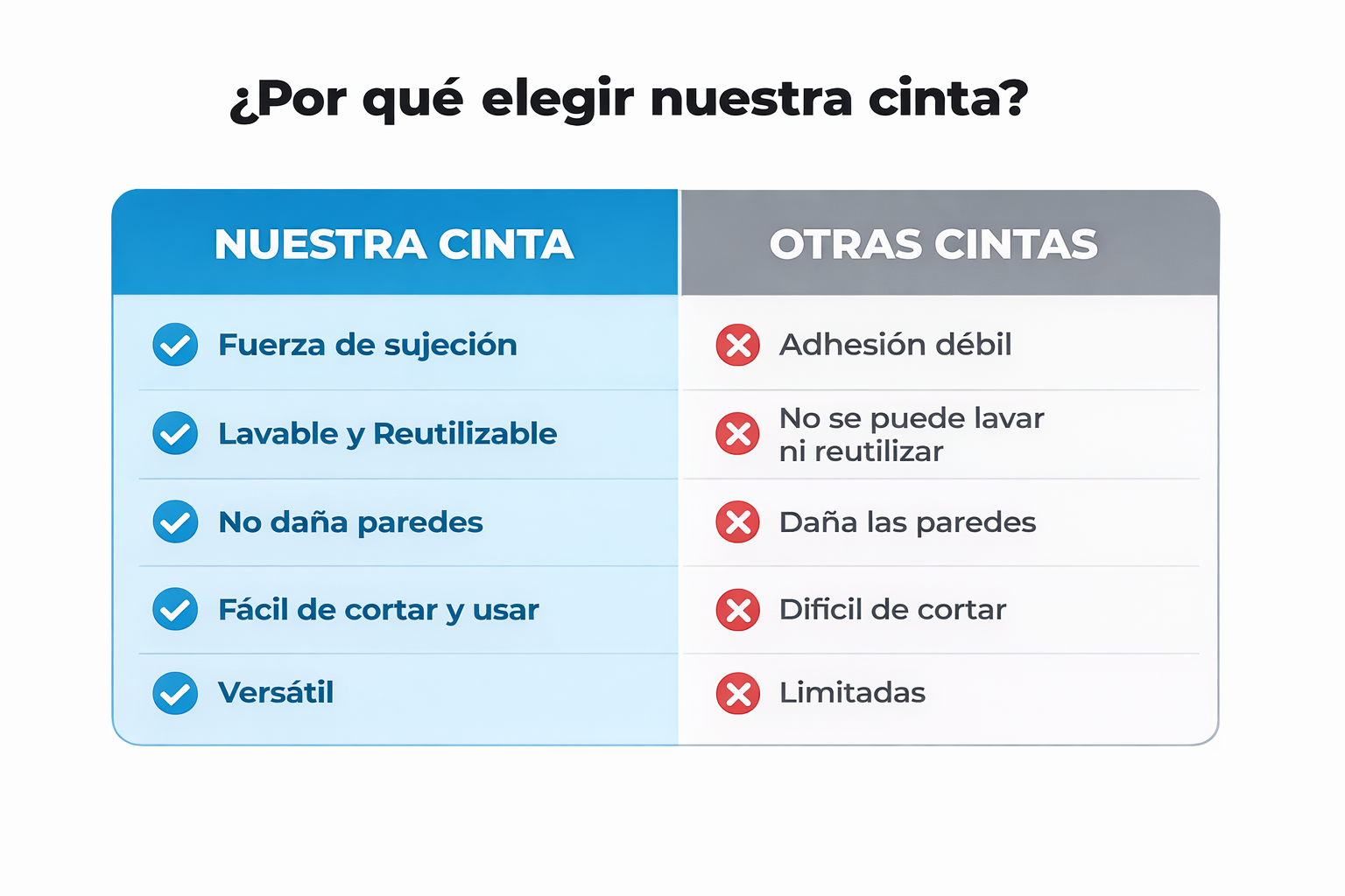Decile adiós al pegamento que arruina las superficies. Nuestra cinta se retira sin esfuerzo, sin dejar rastros ni dañar muebles, paredes o vidrio.